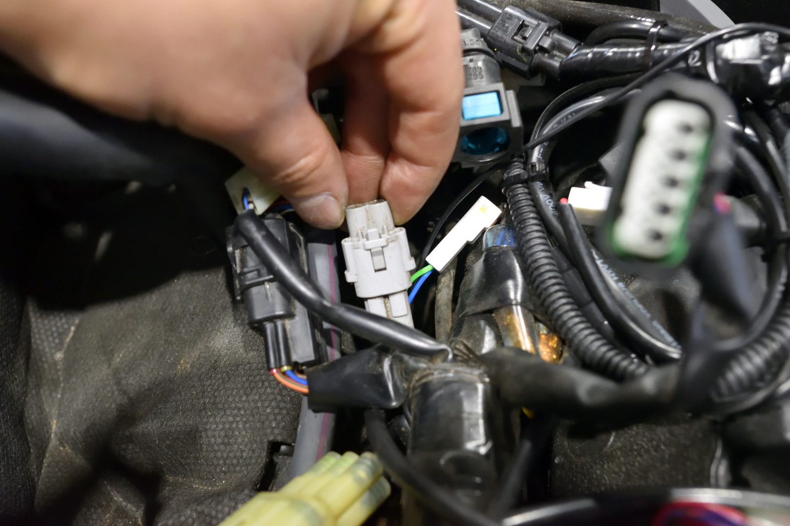 USA仕様がゆえに、これまで一度も使われずに眠っていた「クイックシフター・アップ検知用」のコネクターも発見したので、防水蓋を外して、本製品と接続します。